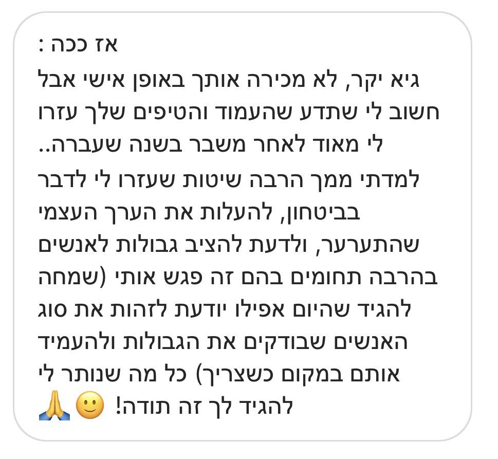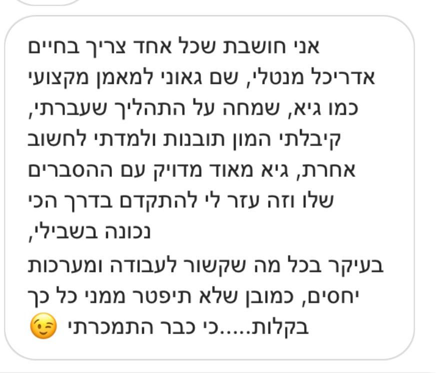 אימון הדגל שלי מורכב מדיסציפלינות מקצועיות כגון חשיבה תוצאתית, פסיכולוגיה חיובית, מיינדפולנס ומדיטציה. דיסציפלינות שלמדתי, התמקצעתי ושיפרתי.