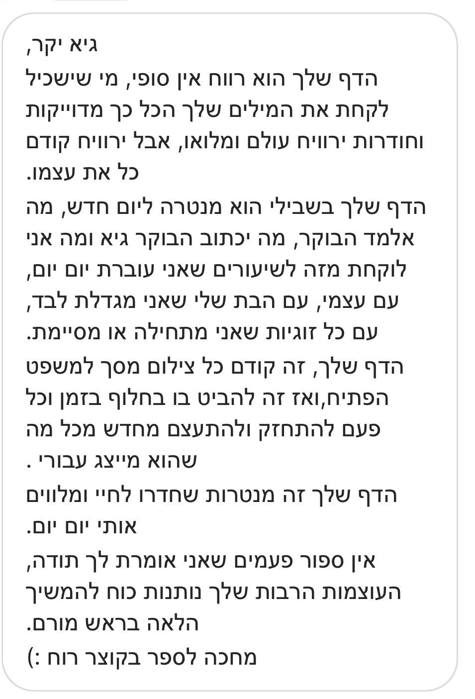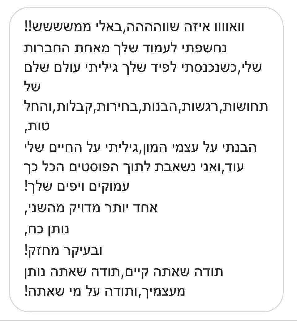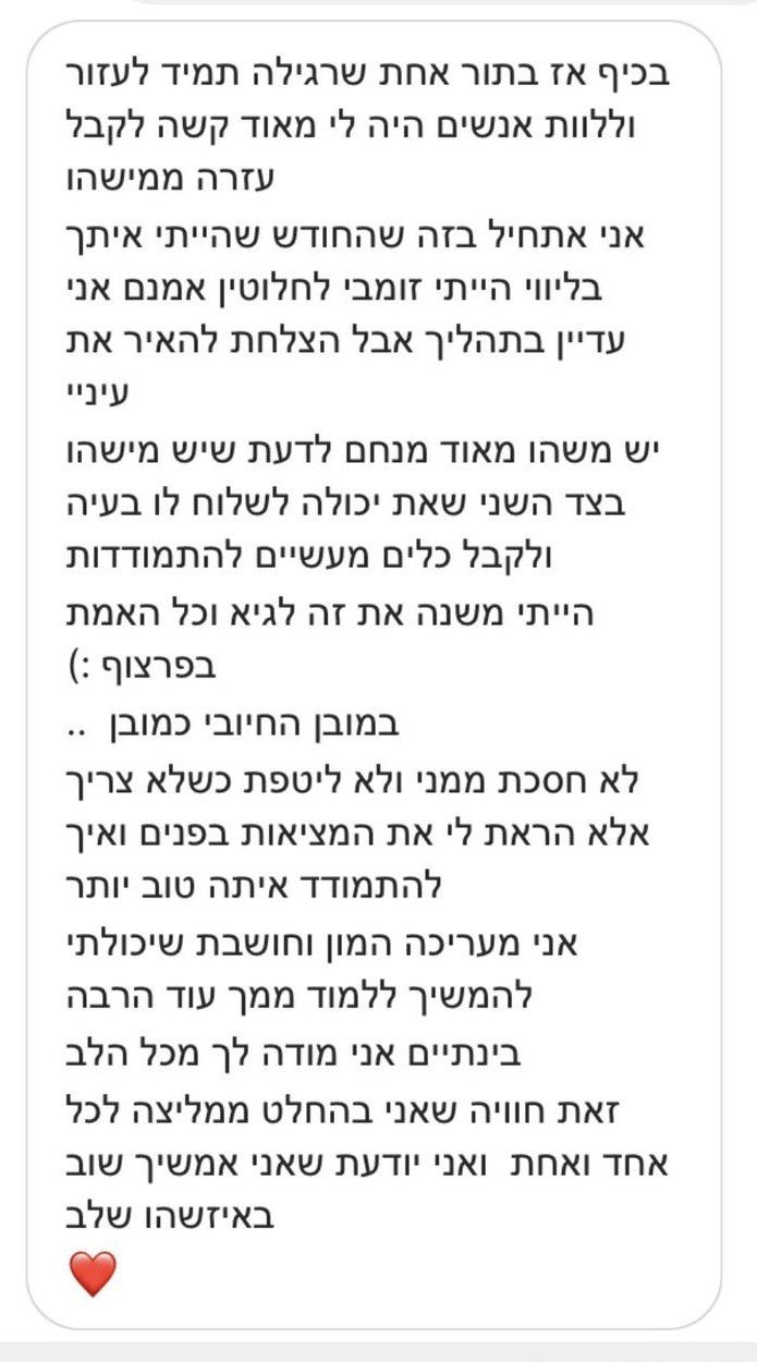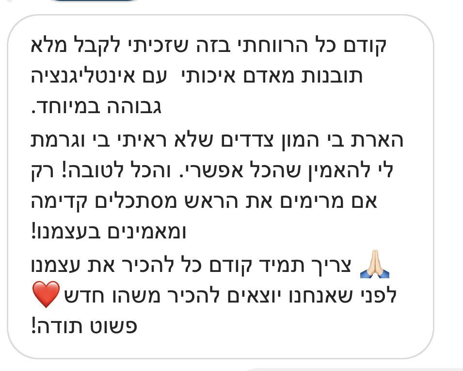 התפקיד העיקרי שלי הוא להראות לכם את עצמכם באור כזה שתוכלו לקחת פיקוד על חייכם. אתם תלמדו על עצמכם מה שלא למדתם או הבנתם אף פעם. יחד נבנה תכנית מדויקת שתיקח אתכם למקומות שתמיד רציתם.